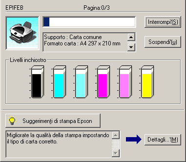 EPSON Spool Manager è simile al Print Manager di Windows. Se Spool Manager riceve contemporaneamente due o più lavori di stampa, li mantiene nell'ordine in cui sono stati ricevuti (nel caso di stampanti in rete, questa funzione viene denominata coda di stampa). Quando un lavoro di stampa raggiunge l'inizio della coda, EPSON Spool Manager lo invia alla stampante. Da Spool Manager è possibile annullare i lavori di stampa. È inoltre possibile visualizzare le informazioni di stato relative ai lavori di stampa inviati a questo prodotto, come anche mettere in pausa e riprendere nuovamente i lavori di stampa selezionati.