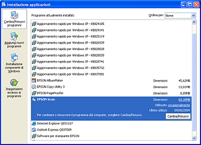 ![]() | Selezionare EPSON Scan dall'elenco, quindi fare clic su Cambia/Rimuovi (Windows XP o 2000) o su Aggiungi/Rimuovi (Windows Me o 98). |