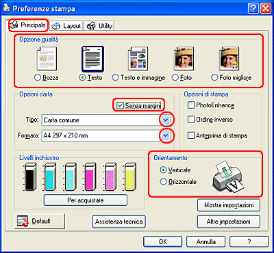 Dopo aver caricato il supporto, modificare le impostazioni del driver della stampante selezionando la stampa senza margini.