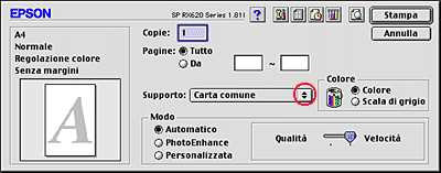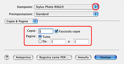 Selezionare Stylus Photo RX620 come impostazione di Stampante, quindi effettuare le impostazioni di Copie & Pagine.