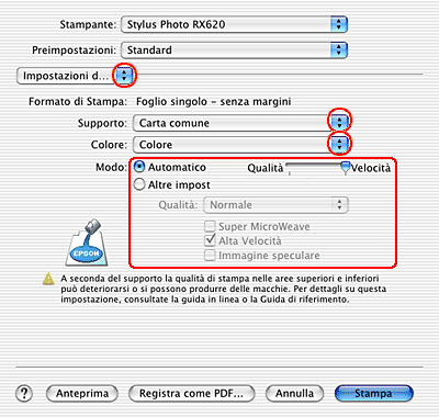 Effettuare le impostazioni appropriate di Supporto, Inchiostro e Modo. Per informazioni dettagliate su Impostazioni di stampa, vedere la guida in linea.