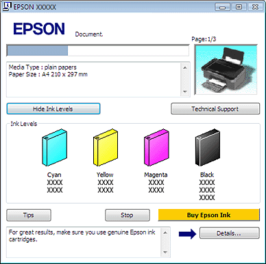 La barra di avanzamento viene automaticamente visualizzata quando si avvia un lavoro di stampa. Da questa finestra è possibile controllare lo stato della cartuccia d'inchiostro. Fare clic sul pulsante Check Ink Levels (Verifica livelli inchiostro) nella schermata della barra di avanzamento per visualizzare lo stato della cartuccia di inchiostro, come mostrato sotto.