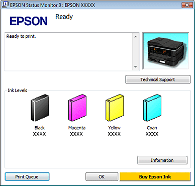 Atidarykite spausdintuvo tvarkyklę, spustelėkite skirtuką Maintenance (Tech. priežiūra), tada paspauskite mygtuką EPSON Status Monitor 3. Paveikslėlyje rodoma rašalo kasečių būsena.