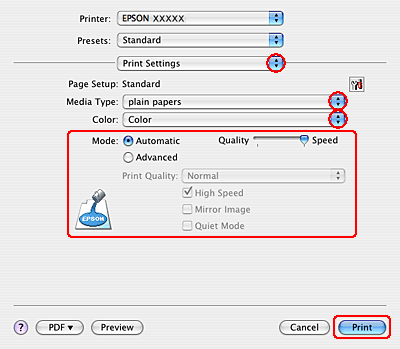 Pasirinkite reikiamus Media Type (Laikmenos tipas), Color (Spalvot.) ir Mode (Režimas) nustatymus. Žr. žiniatinklio pagalbą dėl išsamesnės informacijos apie Print Settings (Spausdinimo nustatymai).