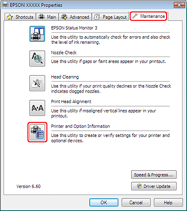 Spustelėkite skirtuką Maintenance (Tech. priežiūra), tada pasirinkite Printer and Option Information (Spausdintuvo ir funkcijų informacija).