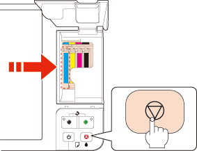 Paspauskite  sustabdymo / priežiūros mygtuką. Jei rašalas yra pasibaigęs dviejose arba daugiau rašalo kasečių ir paspaudžiamas  sustabdymo / priežiūros mygtukas, tai paskesnė kasetė, kurioje rašalas pasibaigęs, perkeliama į pakeitimo padėtį. Pakartokite, kad pakeistumėte kitas reikiamas kasetes. Kai bus pakeistos visos išnaudotos rašalo kasetės ir paspausite  sustabdymo / priežiūros mygtuką, spausdintuvas grąžins spausdinimo galvutę į pradinę padėtį ir pradės pildyti rašalo tiekimo sistemą. Šis procesas užtrunka maždaug pusantros minutės.  maitinimo lemputė nustoja mirksėjusi ir lieka šviesti, o  rašalo lemputė užgęsta.