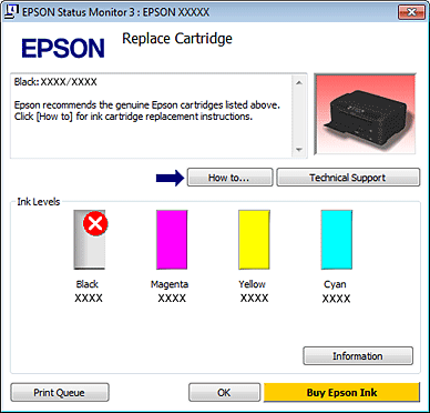 ![]() Kai rašalo kiekis išeikvojamas arba jo lieka labai nedaug, parodomas mygtukas How to (Kaip). Paspauskite pateiktį How to (Kaip), ir funkcija EPSON Status Monitor padės jums pakeisti rašalo kasetę, nurodydama, ką daryti.