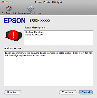 ![]() Naudojant Mac OS XEPSON Status Monitor naudojimasJei funkcija EPSON Status Monitor aptinka spausdintuvo triktį, jums bus parodytas klaidos pranešimas.