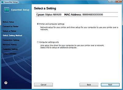 Ekrānā Select Settings (Atlasīt iestatījumus) atlasiet Printer and computer settings (Printera un datora iestatījumi) un pēc tam noklikšķiniet uz Next (Nākamais).