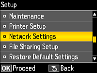 Atlasiet xx. Network Settings un tad nospiediet OK. ("xx" atšķiras atkarībā no izvēlnes.)