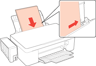 Ievietojiet papīru ar apdrukājamo pusi uz augšu un piebīdiet to pie lokšņu padevēja labās puses. Apdrukājamā puse parasti ir baltāka vai spīdīgāka.