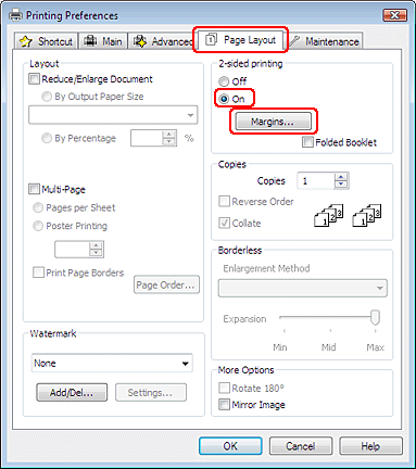 Noklikšķiniet uz cilnes Page Layout (Lapas izkārtojums), tad izvēlieties On (Ieslēgts) sadaļā 2-sided printing (2-pusēja drukāšana).