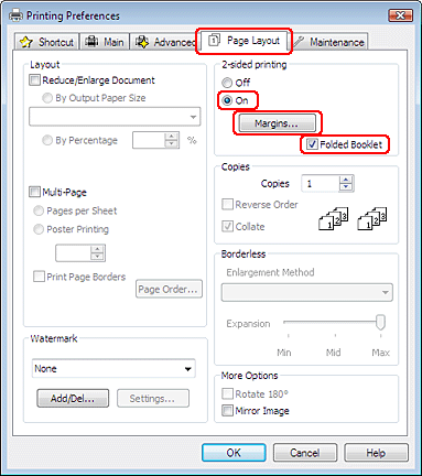 Noklikšķiniet uz cilnes Page Layout (Lapas izkārtojums) un izvēlieties On (Ieslēgts) sadaļā 2-sided printing (2-pusēja drukāšana). Pēc tam atzīmējiet izvēles rūtiņu Folded Booklet (Salocīts buklets).