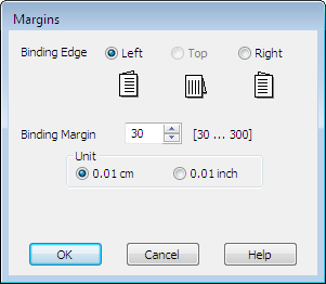 Izvēlieties cm vai inch iestatījumā Unit (Mērvienība). Norādiet iesiešanas piemales platumu.