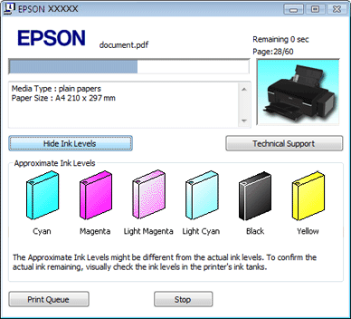 ![]() Kad sākat drukas darbu, progresa indikators parādās automātiski. Šajā logā var pārbaudīt aptuveno tintes līmeni. Noklikšķiniet uz pogas Approximate Ink Levels (Aptuvenais tintes līmenis) norises rādītāja logā, lai attēlotu aptuveno tintes līmeni, kā parādīts zemāk.