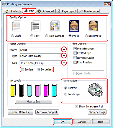Izvēlieties XXX (Sheet Feeder - Borderless) kā Paper Size (Papīra izmērs) iestatījumu, ja vēlaties drukāt fotoattēlus bez apmalēm.
