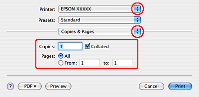 Iestatījumā Printer izvēlieties printeri, kuru izmantojat. Pēc tam izvēlieties Copies & Pages iestatījumus.