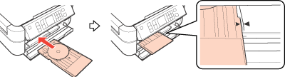 Kad CD/DVD diski uz paliktņa novietoti ar apdrukājamo pusi uz augšu, uzmanīgi iebīdiet CD/DVD paliktni gar priekšējā paliktņa pamatni, līdz atzīmes, kas redzamas uz CD/DVD paliktņa un priekšējā paliktņa, atrodas pretī viena otrai. Katrai CD/DVD paliktņa malai jābūt pareizi ievietotai priekšējā paliktņa skavās.