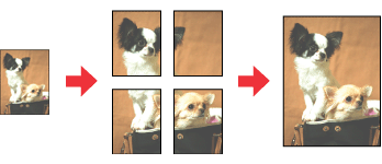 ![]() Poster Printing (Plakātu drukāšana) (tikai operētājsistēmā Windows)Ļauj jums palielināt uz vienas lapas esošu dokumentu tā, lai tas pārklāj 4, 9 vai 16 izdrukātās papīra loksnes, un tad izgatavot no tām plakātu.