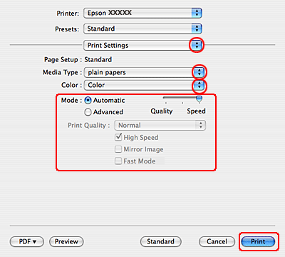 Izvēlieties atbilstošus Media Type (Materiālu veids), Color (Krāsaina) un Mode iestatījumus. Sīkākai informācijai par iespēju Print Settings skatiet tiešsaistes palīdzību.