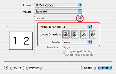 Izvēlieties Pages Per Sheet (Lapas uz vienas loksnes) drukāšanai vienu no šiem iestatījumiem:
