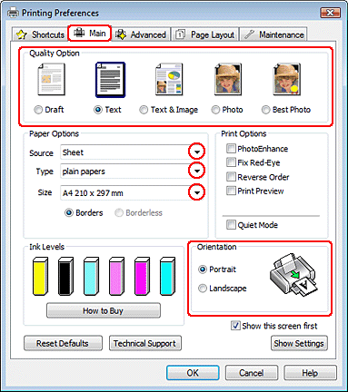 Noklikšķiniet uz cilnes Main (Galvenie), tad izvēlieties vienu no sekojošiem Quality Option (Kvalitātes opcija) iestatījumiem: