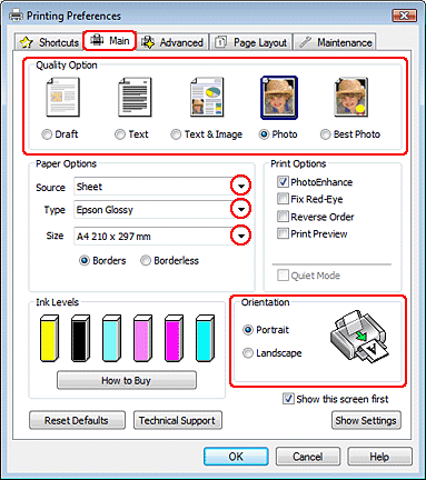 Noklikšķiniet uz cilnes Main (Galvenie), tad izvēlieties vienu no sekojošiem Quality Option (Kvalitātes opcija) iestatījumiem: