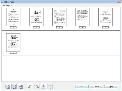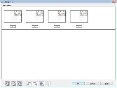 Redzams logs Editing Page (Lapas rediģēšana), kas parāda katras skenētās lapas sīktēlu attēlus.