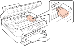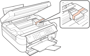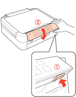 Nostipriniet tintes kasetņu turētāju ar līmlenti pie korpusa, kā parādīts attēlā, pēc tam aizveriet skeneri.