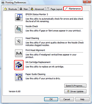 Ja nepieciešams veikt tintes kasetnes nomaiņu pirms tā ir iztērēta vai tās tintes līmenis ir zems, noklikšķiniet uz pogas, kas atrodas Maintenance (Apkope) cilnē.