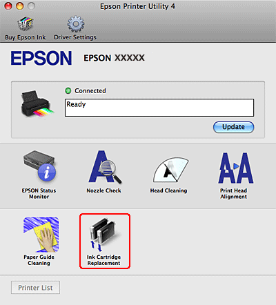 Ja tintes kasetne jānomaina, pirms tā ir izlietota, atveriet dialoglodziņu Epson Printer Utility 4.
