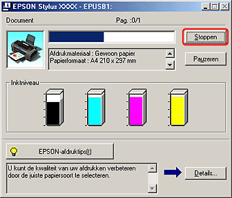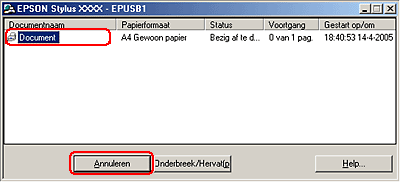 U kunt het afdrukken annuleren met behulp van de voortgangsbalk of de EPSON Spool Manager. Zie het betreffende gedeelte hierna.