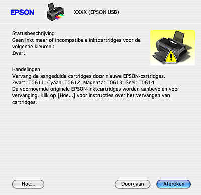 Als de inkt (bijna) op is, verschijnt onder het tekstvak een knop Hoe. Als u op Hoe klikt, wordt u door EPSON Status Monitor 3 stap voor stap begeleid bij de procedure voor het vervangen van de cartridge.