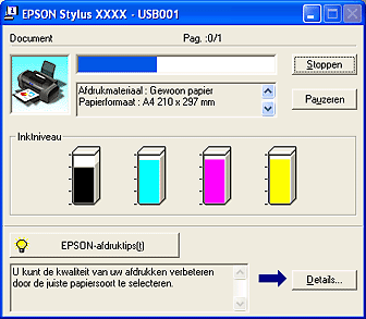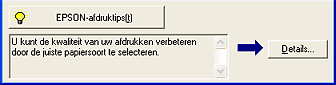 In het tekstvak onderaan het venster van de voortgangsbalk worden tips weergegeven voor een optimaal gebruik van uw Epson-printerdriver. Er verschijnt een nieuwe tip om de 30 seconden. Als u meer informatie wilt over een tip die wordt weergegeven, klikt u op Details.