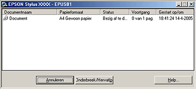 Dit venster geeft de voortgang van de huidige afdruktaak aan en bevat informatie over de printerstatus. In dit venster verschijnen bovendien foutberichten en nuttige tips voor het afdrukken. Raadpleeg het betreffende gedeelte hierna.