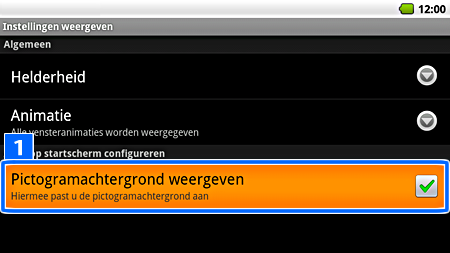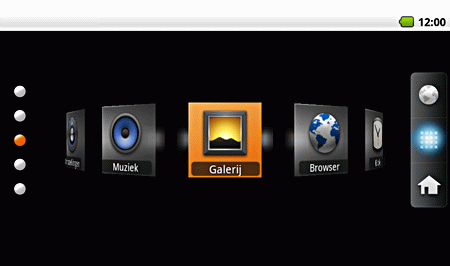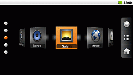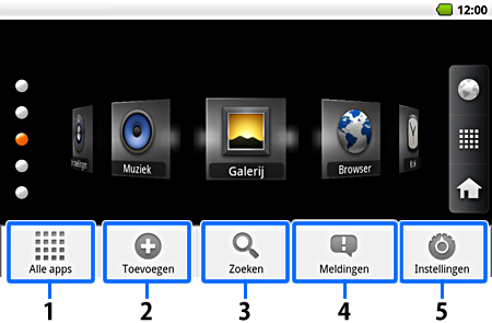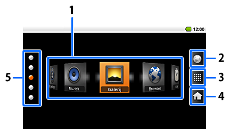1 Toepassingen starten met snelkoppelingen. U kunt snelkoppelingen toevoegen, verplaatsen en verwijderen. "Een snelkoppeling toevoegen aan het startscherm" "Een snelkoppeling verplaatsen in het startscherm" "Een snelkoppeling verwijderen uit het startscherm" 2 De browser starten (internet). 3 Alle geïnstalleerde toepassingen weergeven. 4 De weergave van het startscherm wijzigen. "De weergave van het startscherm wijzigen" 5 De lijst met snelkoppelingen wijzigen. |