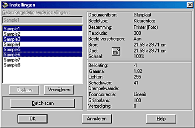 Als u één afbeelding wilt scannen met uiteenlopende instellingen, maak dan eerst alle verschillende groepen met instellingen en sla ze op zoals hiervoor beschreven. Houd nu Ctrl ingedrukt en klik op alle gewenste aangepaste instellingen in de keuzelijst Gebruikergedefinieerde instellingen om ze te selecteren. Wanneer u alle instellingen waarmee u wilt scannen hebt geselecteerd, klikt u op de knop Batch-scan. De afbeelding wordt nu apart gescand voor elke groep instellingen die u hebt geselecteerd.