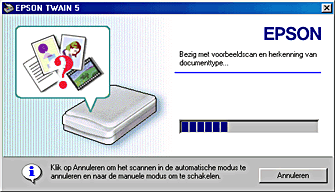 ![]() | Klik tijdens het maken van de voorbeeldscan en het herkennen van het type document op Annuleren (dus wanneer het volgende dialoogvenster wordt weergegeven). |