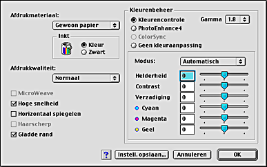 Als u in het afdrukvenster de optie Automatisch selecteert als instelling bij Modus, worden alle gedetailleerde instellingen automatisch door de printerdriver verzorgd op basis van de huidige instellingen bij Afdrukmateriaal en Inkt. Zie Opties voor Inkt instellen voor informatie over het instellen van Inkt. Zie Afdrukmateriaal instellen voor informatie over het instellen van Afdrukmateriaal.