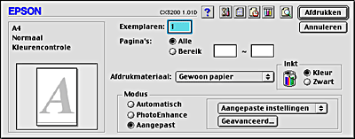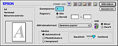 Met de opties voor Modus in het afdrukvenster hebt u de beschikking over drie besturingsniveaus voor de printersoftware. Dit wordt hierna uitgelegd.