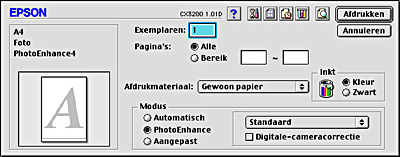 Als u PhotoEnhance selecteert, wordt ook het selectievakje Digitale-cameracorrectie beschikbaar. Schakel dit selectievakje in als u foto's afdrukt die met een digitale camera zijn genomen en als u wilt dat de afgedrukte afbeeldingen er net zo natuurlijk uitzien als foto's die met een filmcamera zijn genomen.