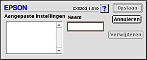 Als u uw geavanceerde instellingen wilt opslaan in de lijst Aangepaste instellingen, klikt u in het dialoogvenster met geavanceerde instellingen op Instell. opslaan. Het dialoogvenster Aangepaste instellingen verschijnt.
