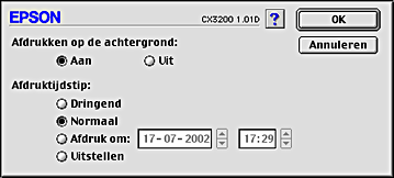 ![]() | Selecteer indien nodig Aan als optie voor Afdrukken op de achtergrond. |