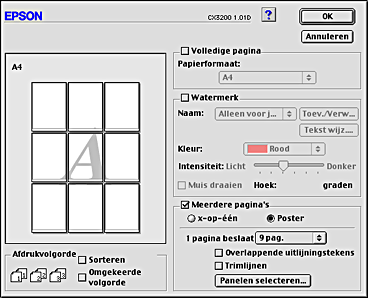 Wanneer u het selectievakje Meerdere pagina's inschakelt, kunt u de optie x-op-één of Poster kiezen. Raadpleeg het betreffende gedeelte hierna.