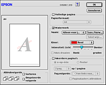 Selecteer het watermerk dat u wilt afdrukken in de lijst Naam en geef de gewenste positie, kleur en intensiteit op. U kunt de positie en het formaat van het watermerk wijzigen door het met uw muis te verslepen in het voorbeeldvenster aan de linkerzijde van het dialoogvenster.