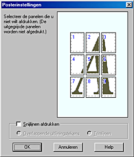 Als u niet de volledige poster maar slechts een aantal panelen wilt afdrukken, klikt u op de panelen die u niet wilt afdrukken en klikt u vervolgens op OK om het dialoogvenster Posterinstellingen te sluiten.