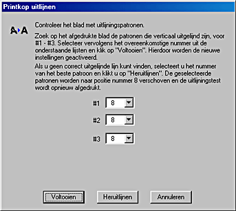 Kies van elk patroon op het afgedrukte testblad de verticale lijn die het beste is uitgelijnd. Selecteer in het dialoogvenster Printkop uitlijnen het betreffende lijnnummer in de keuzelijst en klik vervolgens op Voltooien om de nieuwe instelling door te voeren.