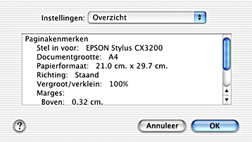 Door in het dialoogvenster voor de pagina-instellingen de optie Overzicht te selecteren bij Instellingen kunt u de instellingen van het dialoogvenster voor de pagina-instellingen nog eens nakijken.