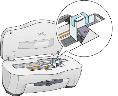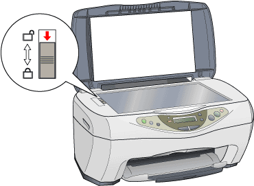 Open de scannereenheid en controleer of de printkoppen zich in de uitgangspositie bevinden. Plak de houder van de cartridges met plakband aan het apparaat vast (zie illustratie) en sluit de scannereenheid.