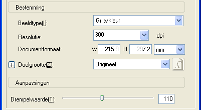 ![]() | Geef bij Doelgrootte het uitvoerformaat van de gescande afbeeldingen op en geef vervolgens de instellingen bij Aanpassingen op, indien nodig. Zie Schitterende reproducties maken voor meer informatie. |
